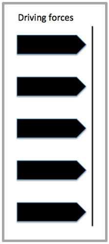 Driving forces push to influence a situation in a particular direction.  Driving forces work to support a stated goal or objective. They are usually seen as ‘positive’ forces that facilitate change.  Examples of some Driving forces include: