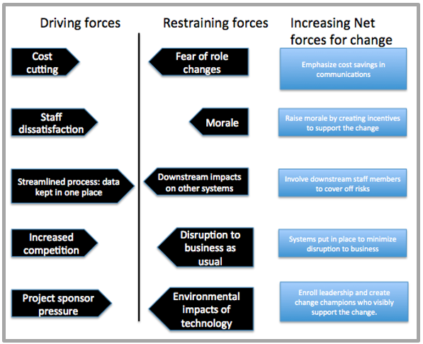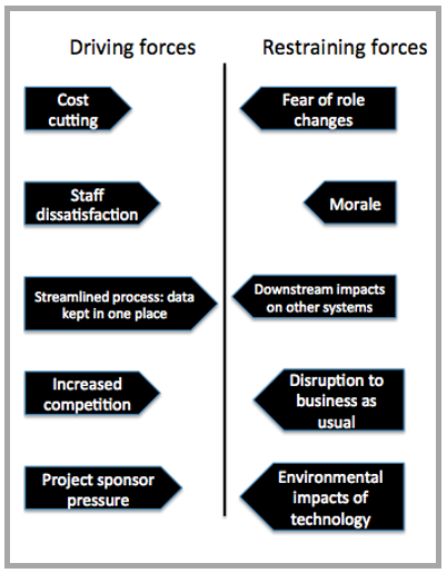 • Analyzing the Driving and Restraining forces that affect a transition from the current state to the future state. Restraining forces may include reactions from those who see change as ‘unnecessary’ or constituting a ‘threat’