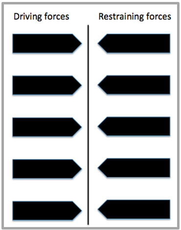 The model portrays driving forces (those that are working in the direction of the change) and resisting and/or restraining forces (those that tend to support the status quo). These are arranged as a field of opposing forces, or as a “force field.”