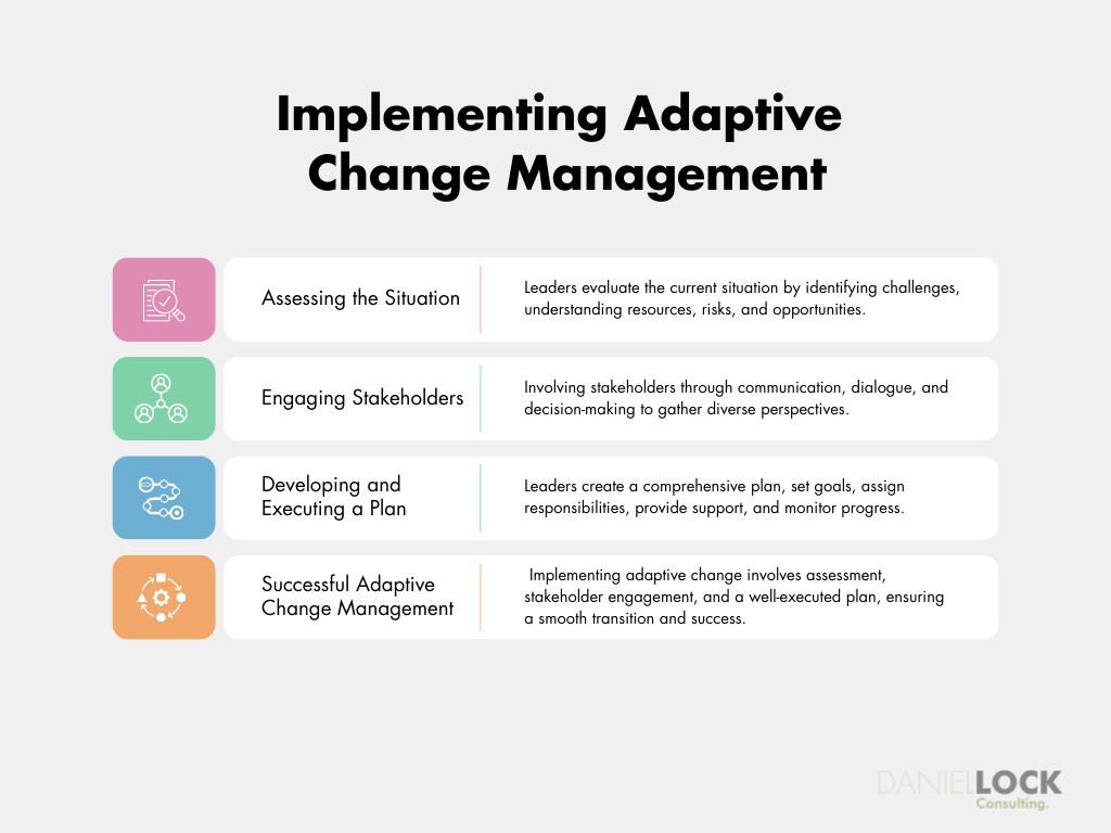 To successfully implement adaptive change management, leaders need to follow a structured process, based on principles, that involves assessing the current situation, engaging stakeholders, and developing and executing a plan.