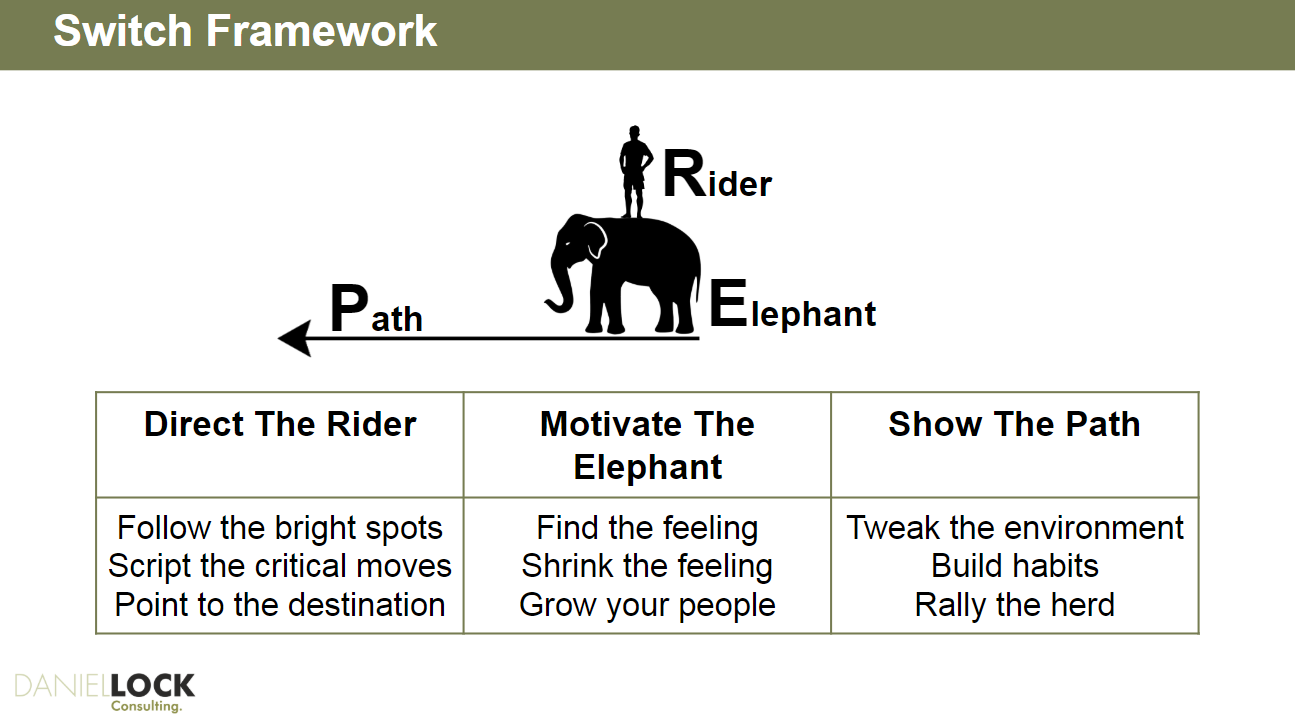 The Switch framework is from the book Switch from Dan and Chip Heath. An excellent book that combines the discipline of psychology with behavioural economics to come up with a model of personal change.