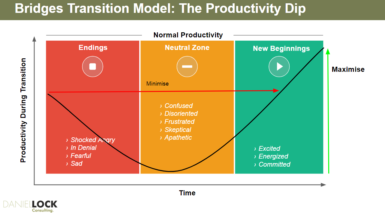 It is important to help people move through the three phases as soon as possible as productivity typically decreases through the Transition period.